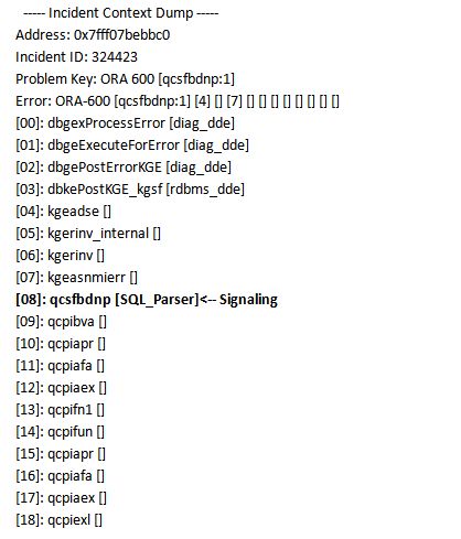 这个问题带给我的最大福利就是能够复现,这一点真是非常难得,有很多的 ORA-00600 错误复现需要上下文环境触发一定的条件才可以复现,可遇不可求,就像前些天社群的一篇文章《腾讯高级工程师:一道面试题引发的高并发性能调试思考》,需要动用大量的技巧来复现分析,可能是一个平均运行一百万次才出现一次的 bug。而这个问题让我省了不少事,在 alert 日志中也发现了对应的 trace 文件,但是从里面得到的信息着实有限。