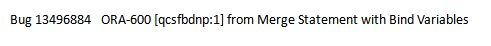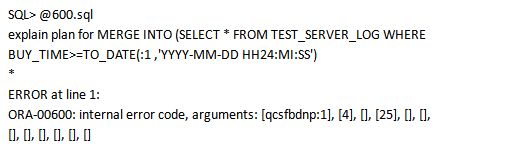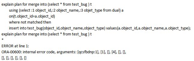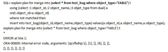 所以这个时候就比较纠结,很多应用场景都是需要使用绑定变量的,所以尽管如此,这不是一个通用的解决方法。然后我尝试在 using 子句中添加一个绑定变量,ORA-00600 问题再次出现,可见二十多个绑定变量和一个绑定变量都会出现同样的问题。
